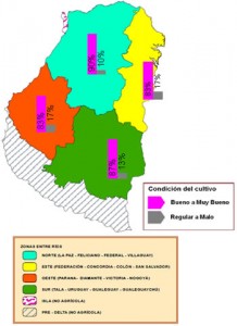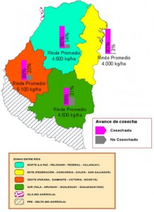 El rendimiento promedio se ubica en 7.800 kg/ha, detectándose una reducción de 200 kg/ha con relación al reporte de la semana pasada, esta merma se debe a que comenzó la trilla de lotes que presentan vaneo en los granos como consecuencia de la falta de radiación solar en el período de floración.