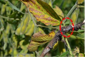 En forma inmediata al comienzo de las lluvias frecuentes desde fines de enero y durante todo el mes de febrero, la mancha marrón causada por el hongo Septoria glycines, avanzó rápidamente desde las hojas basales hasta el tercio superior (Fotografía 1) en lotes sin aplicaciones químicas, tornándose en la enfermedad más relevante de la presente campaña causando intensas defoliaciones. Esta patología foliar fue la que definió el uso de control químico a partir de R3 observándose excelentes resultados.