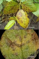 La roya asiática (Phakopsora pachyrhizi) cuya primera detección se registró a comienzos del mes de febrero, aproximadamente 20 días antes que en la campaña 2012/13, está actualmente presente con altos niveles de incidencia y severidad crecientes no preocupantes, sin embargo hay folíolos con más del 80% con pústulas urediniosóricas (Fotografía 2).