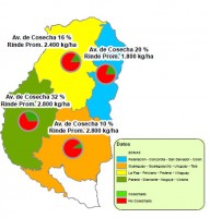 El rendimiento promedio está cercano a 7.800 kg/ha, con valores máximos de 9.000 kg/ha en chacras puntuales y mínimos próximos a 5.500 kg/ha.