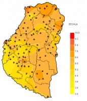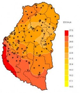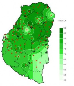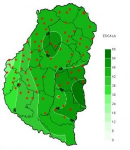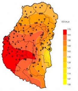 En el mapa quedan claramente diferenciados los departamentos del norte, donde se agrupan los registros pluviales más importantes. Los mismos decrecen sobre el centro, reduciéndose a unos 20 milímetros para declinar aún más sobre el sur en forma de lluvias débiles, lloviznas o zonas donde incluso no ha llovido.