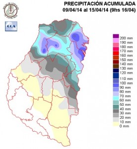 Luego de las importantes lluvias de la primera parte de abril, se observó una intensa circulación del sudoeste, la cual fue desplazando progresivamente la masa de aire húmedo hacia el centro norte de la Mesopotamia y el este del NEA. Sobre la provincia de ER en particular, este desecamiento del aire se notó primeramente en el sur y luego se fue generalizando. Esta diferenciación de masas de aire fue la que a la postre definió el comportamiento de las lluvias del último evento.