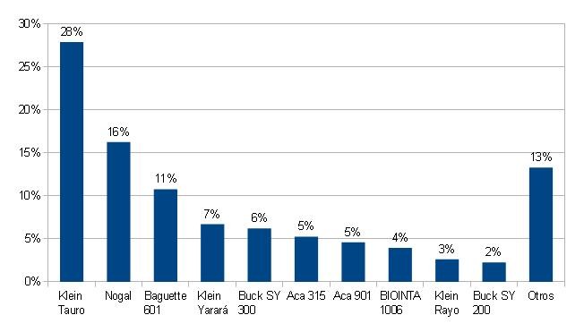 Los diez cultivares más utilizados en la campaña 2014/15 se dan a conocer en el Gráfico Nº 3, ocupando los tres primeros lugares las variedades Klein Tauro, Nogal del semillero Sursem y Baguette 601 de Nidera, que suman un 55% de la superficie encuestada.