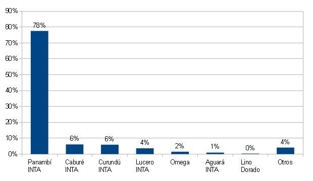 Los cultivares de lino utilizados y la proporción de cada uno se detallan en el gráfico N° 5. Al respecto Panambí mostró una gran participación en esta campaña abarcando aproximadamente un 78% de la superficie relevada.