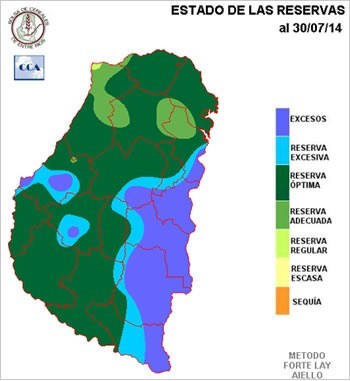 El balance hídrico mantiene condiciones de excesos hídricos sobre buena parte de los departamentos linderos del Uruguay, observándose además algunos sectores dispersos en áreas de Paraná y Nogoyá.