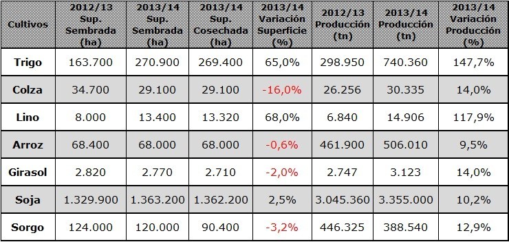 El siguiente cuadro compara los datos estadísticos finales de trigo, colza, lino, arroz, girasol, soja y sorgo de las dos últimas campañas agrícolas en Entre Ríos.