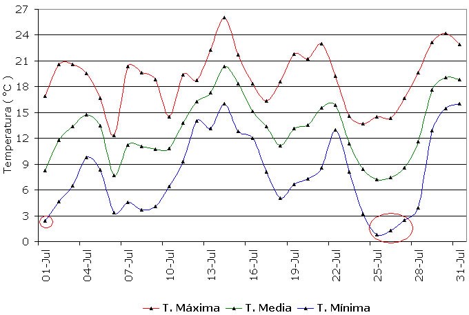 El viernes 25 fue el día más frío de julio, siendo el promedio de las temperaturas mínimas en la Red de 0,8 ºC y por otra parte, el día más cálido fue el lunes 14 con máximas que promediaron 26 ºC y con un valor mínimo de 16 ºC.