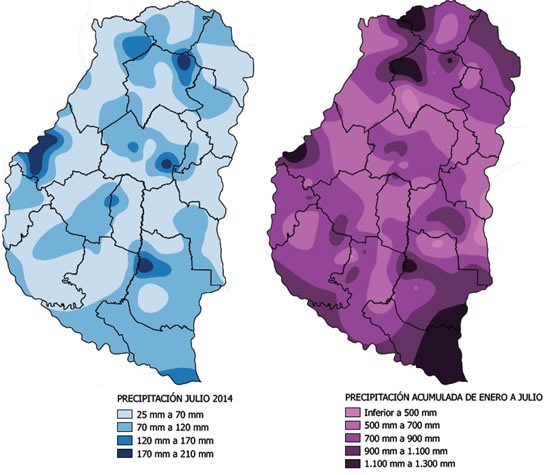 Un párrafo aparte merece la lluvia acumulada entre enero y julio, la mayor parte del área tuvo precipitaciones que superaron los 500 mm y fueron inferiores a 900 mm, destacándose sectores donde las lluvias han alcanzado el valor esperado anual (ver Mapa Nro. 2).