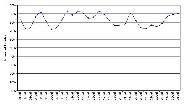 Las abundantes precipitaciones y las escasas heladas durante julio determinaron un ambiente con elevada humedad relativa, contabilizándose 19 días donde el valor de la humedad relativa media diaria superó el valor medio para el mes que se posiciona en el 80% (ver Gráfico Nro. 4).
