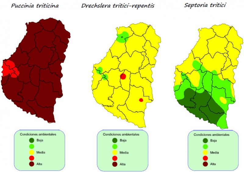Analizando las variables para Drechslera tritici-repentis (Mancha amarilla), los valores estuvieron cerca del rango mínimo en algunos sectores, llegando a alerta «rojo» en una sola estación.