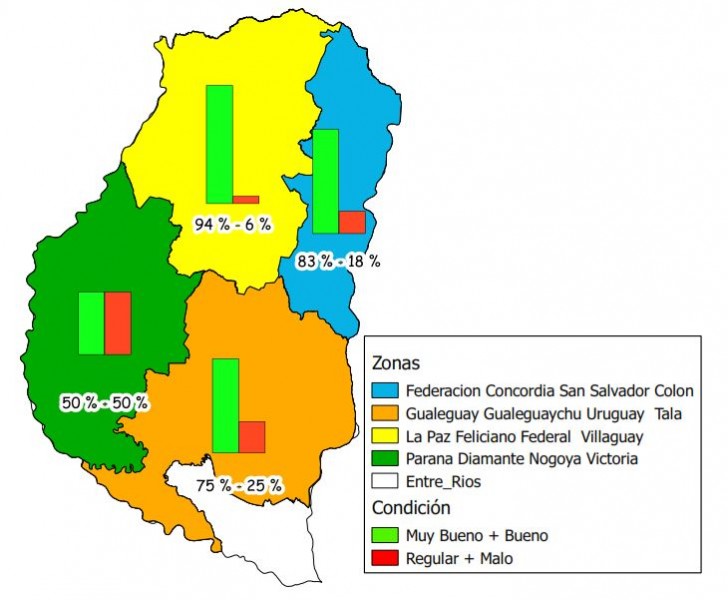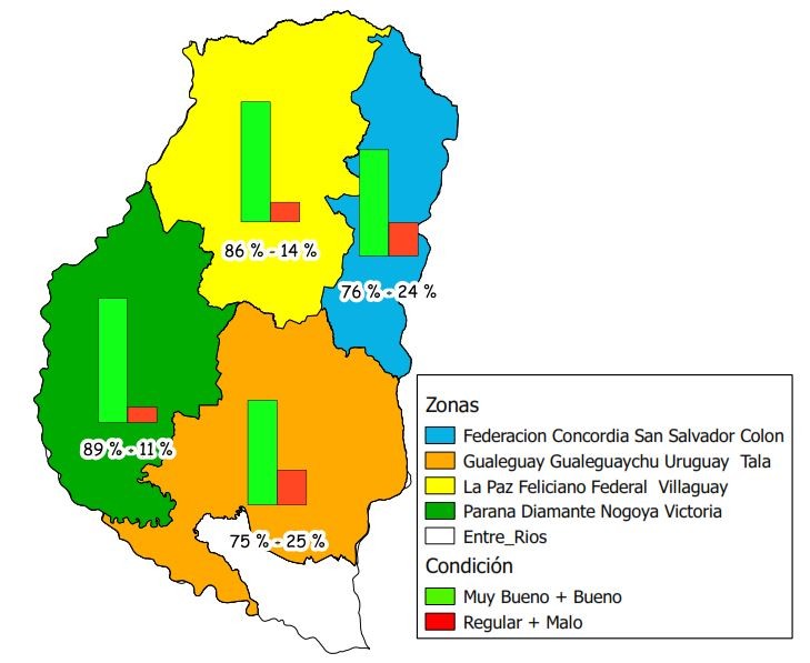 La condición del cereal en la provincia se presenta de muy buena a buena en un 86% y regular a mala en el 14%. Mapa N° 1.