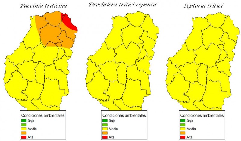 Las condiciones climáticas que definen el desarrollo de las enfermedades foliares del trigo son desfavorables en los últimos días fundamentalmente en lo que se refiere a las horas de mojado foliar. Este factor es limitante y se detectó un crecimiento muy leve de la incidencia de la roya de la hoja o roya anaranjada (P. triticina) en cultivares de conocida susceptibilidad.