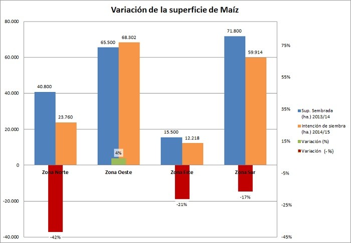 Se observa que la zona oeste es la única que presenta un incremento positivo a causa de la concentración de fábricas de alimento balanceado que utilizan el insumo maíz para consumo animal y otro aspecto importante es la cercanía al puerto de Rosario que provoca una merma en los costos de flete. En las demás zonas la intención de siembra es negativa, si se lo compara con la anterior campaña.