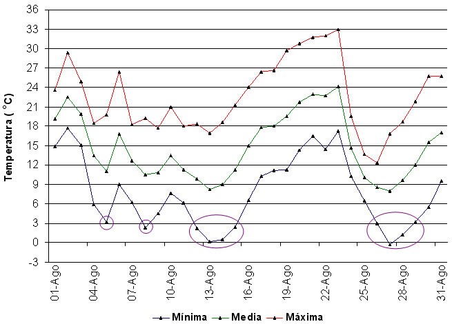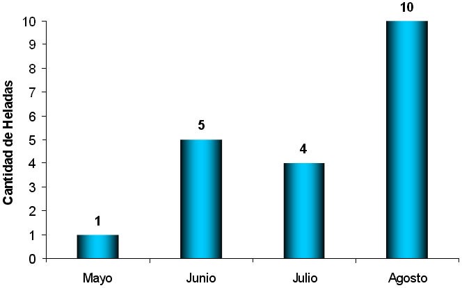 Entre los meses de junio y julio (donde históricamente se presentan las temperaturas mínimas más bajas) se contabilizó un total de 9 días con heladas; sin embargo agosto ha sido el mes donde más heladas se han detectado llegando a un total de 10 (la mitad de las contabilizadas hasta el momento).