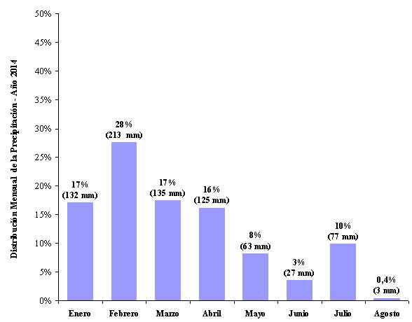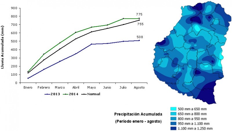 El valor promedio de la precipitación en Entre Ríos desde enero a agosto del 2014 se sitúa en 775 mm, ubicándose muy próximo al valor histórico esperado que es de aproximadamente 755 mm.