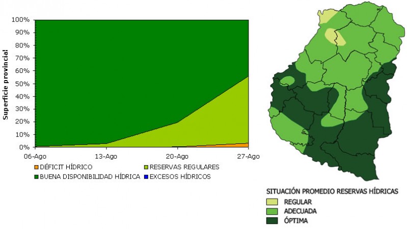 En la primera semana el 100% del territorio poseía una buena disponibilidad hídrica que fue reduciéndose hasta llegar a fines del mes a un valor del 45%, incrementándose así el área con reservas regulares y algunos sectores con déficit hídrico.