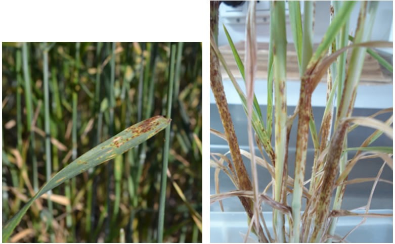 Algo poco usual, es el crecimiento en sectores más húmedos de la planta de pústulas de roya del tallo (Puccinia graminis-tritici); esta enfermedad es comúnmente registrada desde los últimos 5 años en los meses de octubre y con mayor relevancia a fines de noviembre, cuando el grano ha alcanzado la madurez pastosa dura. Sin embargo, en la campaña anterior se registró tempranamente en cultivares de trigo al estado de grano en madurez acuosa.