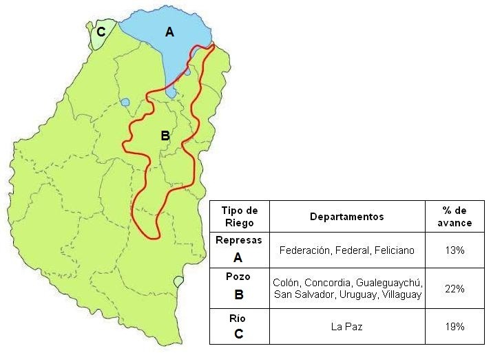 Si se tiene en cuenta el tipo de riego, la zona que mayor avance presenta en las labores de siembra es la zona de pozo con un 22% (ver Mapa Nº1).