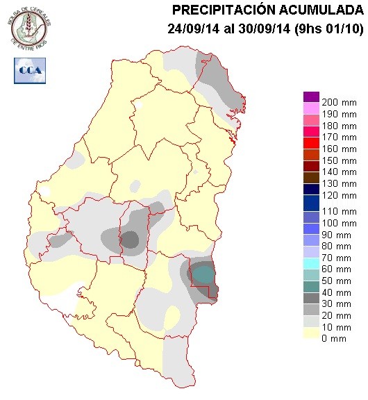 Al ver el mapa las lluvias de gran escala no pasan la barrera de los 10 milímetros y en los departamentos del norte las mismas son mayoritariamente inferiores a 5 milímetros, o incluso nulas. Hacia el extremo noreste, la influencia de una zona más activa en el sudeste de Corrientes, favoreció el despliegue de algunas precipitaciones más generosas en la última jornada de septiembre.