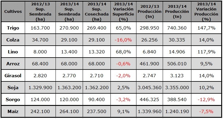 El siguiente cuadro compara los datos estadísticos finales de trigo, colza, lino, arroz, girasol, soja, sorgo y maíz de las dos últimas campañas agrícolas en Entre Ríos.