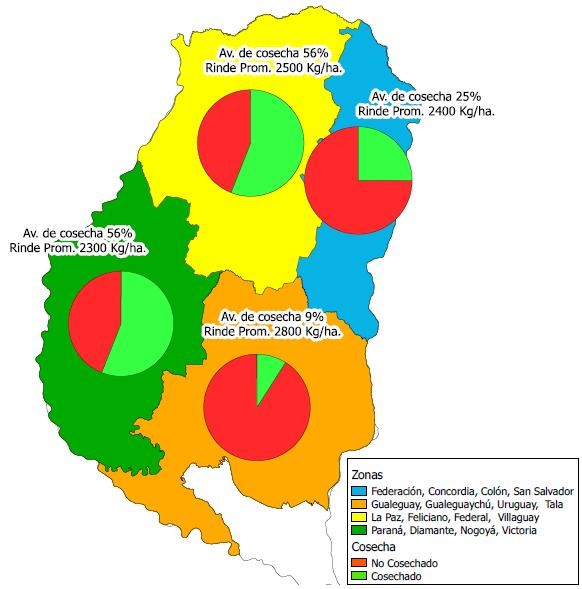 El Mapa Nº 1, refleja los rindes promedios y las hectáreas trilladas en las diferentes zonas, se destacan la norte y oeste en las cuales el porcentaje de avance se posiciona en el 56% representando ambas el 60% de la superficie total implantada.