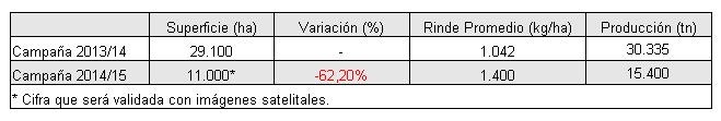 Con mínimos de 300 kg/ha y máximos de 1.800 kg/ha, el rendimiento promedio se ubica cercano a 1.400 kg/ha. Si bien este valor muestra un incremento de alrededor del 26% en comparación con el rinde obtenido en el ciclo 2013/14 que fue de 1.042 kg/ha, no alcanza a compensar la caída en la producción, estimándose que la misma en la presente campaña se posicionaría por debajo de 16.000 toneladas lo que significa una merma de aproximadamente el 50%. Cuadro Nº1.