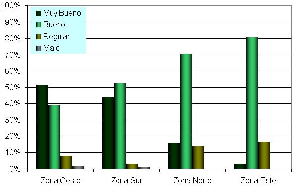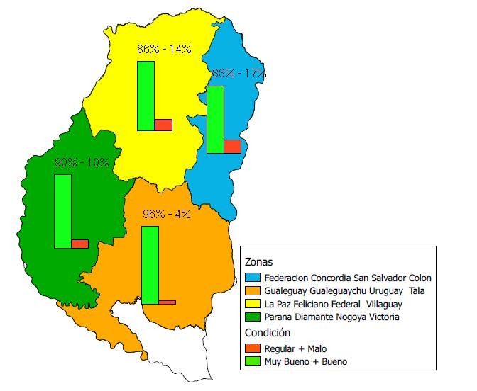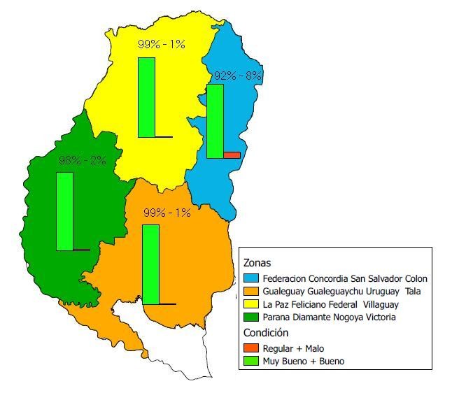 Mientras que el centro-norte que ocupa alrededor del 32% de lo implantado y que agrupa al sector norte (La Paz, Villaguay, Federal y Feliciano) y al sector este (San Salvador, Colón, Concordia y Federación) presenta tan solo entre el 3% y 16% en una condición evaluada como muy buena, (ver Gráfico Nro. 1).