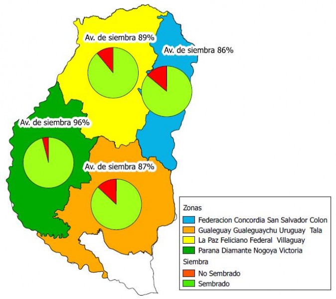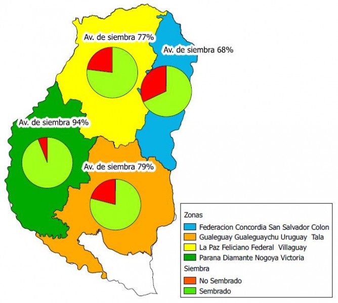 En la geografía entrerriana el panorama general de la oleaginosa es prometedor, considerando un área implantada que se ubicaría alrededor de 1.180.000 ha, se ha estimado que el 91% de la superficie cuenta con una condición calificada entre buena y muy buena, regular el 8% y mala el 1% restante. (ver Mapa Nº 1).
