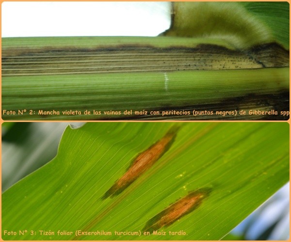 Los maíces de primera, en general se encuentran en madurez fisiológica con estado sanitario muy bueno, aun cuando se han observado lotes con presencia de roya común (Puccinia sorghi), tizón foliar (Exserohilum turcicum) y mancha ocular (Kabatiella zeae) sin probables efectos sobre el rendimiento final del cultivo. El área foliar verde remanente está sana con algunos “lunares blancos” y senescencia marcada de la 3 hojas inferiores. Es posible que no haya ocurrido removilización de fotoasimilados desde el tallo y es alta incidencia de la mancha violeta de las vainas donde se observa la presencia de Fusarium spp. y Gibberella spp. (Foto Nº 2), cuya importancia se desconoce, pero es altamente probable que tenga implicancia en la epidemiología de las enfermedades de las espigas.