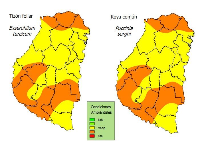 En los maíces de siembra de segunda o tardíos que se encuentran en diversos estados fenológicos entre V8 y R3-R4 se detectan síntomas de tizón foliar por E. turcicum con baja incidencia en la mayoría de los híbridos, pero con alta incidencia y severidad, en híbridos susceptibles (Glagovsky, com. personal) en el E. de Entre Ríos.