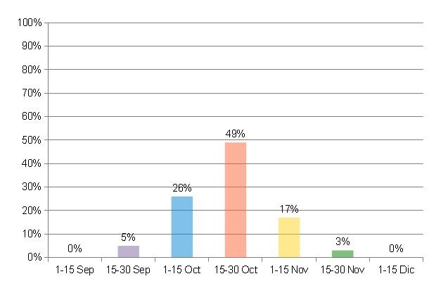 Si se observa el Gráfico Nº 1 se puede apreciar que solo un 5% de los lotes concretó la emergencia en la segunda quincena de septiembre, mientras que el 75% de la superficie evaluada lo hizo en el mes de octubre (con mayor peso en la segunda quincena) y el 20% restante en noviembre.
