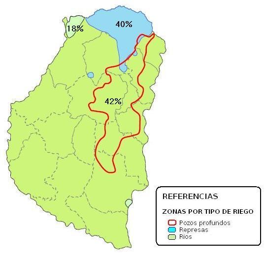 Con respecto a la fuente de riego utilizada, el 42% del área encuestada pertenció a riego por pozo, 40% a zona de represas y en tercer lugar se ubicó con el 18% aquellos lotes que emplean el agua proveniente de ríos y/o arroyos (ver en el Mapa Nº 1). Si se comparan estos resultados con los del ciclo 2013/14 se verifica que no exiten variaciones de importancia.