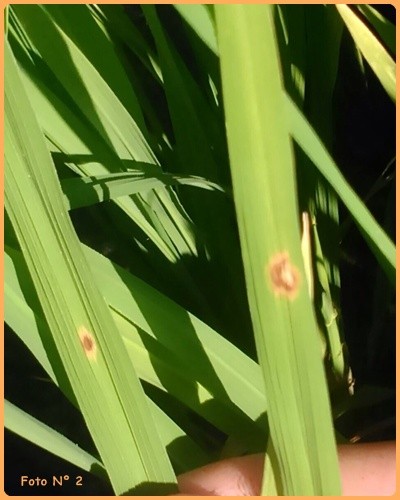 En cuanto al estado sanitario se ha detectado la presencia de «Pyricularia», principalmente en el norte de la provincia y de manchas foliares en la mayoría de las arroceras, por lo que se están efectuando las aplicaciones con fungicidas. Foto N° 2.