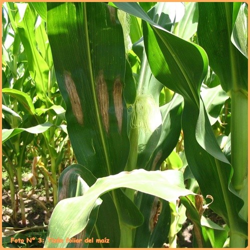 Las condiciones son ligeramente más favorables para el tizón foliar (E. turcicum), enfermedad de desarrollo agudo, que puede disminuir el área fotosintética en pocos días (Foto Nº 3).