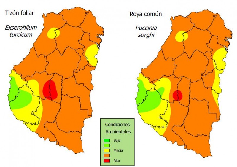 El alerta para las enfermedades más importantes del maíz, indica riesgo medio para tizón foliar y roya común (Mapa N° 2), pero con una tendencia creciente lo que indica aumentar la frecuencia del monitoreo apenas se pueda acceder a los lotes.