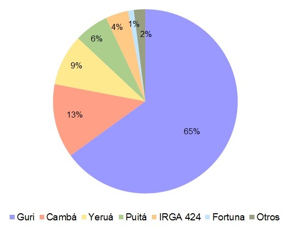 Por segundo año consecutivo la variedad Gurí fue la que mayor participación obtuvo, ocupando aproximadamente un 65% del total del área encuestada.