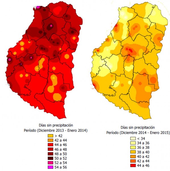 Los mapas que a continuación se presentan reflejan la cantidad total de días sin precipitaciones entre los meses de diciembre y enero para el ciclo agrícola 2013/14 versus 2014/15.