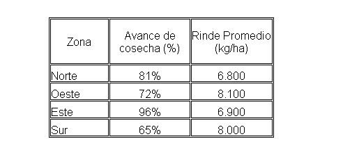 El rendimiento promedio provincial ha vuelto a experimentar variaciones con relación al informe de la semana anterior, con un incremento de 200 kg/ha ubicándose alrededor de los 7.800 kg/ha. Si se analiza a nivel de zonas, la Oeste y Sur se destacan con un rinde promedio cercano a los 8.000 kg/ha, ver Cuadro Nº1.