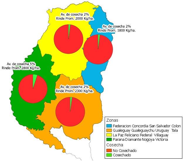 En el Mapa Nº 2 se muestra el grado de avance por zona y el rinde respectivo.