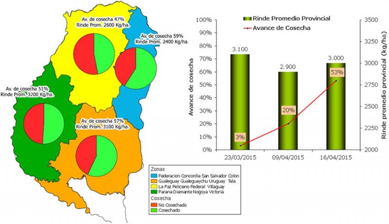 El rendimiento promedio provincial se sitúa alrededor de 7.500 kg/ha, por lo tanto la producción entrerriana de arroz se aproximaría a 556.500 tn.