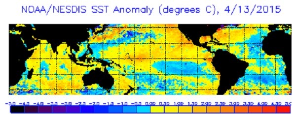 Vayamos al período más próximo. Sabemos como está hoy la situación en algunas regiones de Entre Ríos después de haber transitado un mes de marzo y principios de abril con muy poca oferta de agua por parte de la atmósfera, y sin entrar en detalles técnicos, el origen de la falta de lluvias se debió a que la distribución de temperaturas superficiales del Océano Atlántico presentaba anomalías positivas en el litoral sur del continente sudamericano (ver la Figura 1), las mismas están actualmente presentes y su persistencia durante este mes haría que las lluvias se ubiquen en valores por debajo de los normales. Esto está provocando un atraso en el patrón de lluvias en toda la región pampeana y si bien es un efecto positivo para el levantamiento de la cosecha gruesa actual, no permitiría la recomposición de perfiles de humedad adecuados para entrar a la fina 2015/16, aunque este fenómeno se ubicaría más hacia el sur de Entre Ríos y provocaría problemas en el núcleo triguero nacional (sudeste bonaerense). Seguiremos hasta mayo con un tiempo templado y se atrasarían las heladas (también predominantemente en el sur de la región pampeana). O SEA, PARA EL TRIGO PODRÍAN NO RECUPERARSE LAS RESERVAS Y DEBERÍAMOS ESPERAR UN INVIERNO CON LLUVIAS POR DEBAJO DE LOS VALORES NORMALES. Siempre repetimos por su importancia que DADA LA INESTABILIDAD ATMOSFERICA PRESENTE NO HAY QUE DESCARTAR EFECTOS CONVECTIVOS QUE PRODUCEN MUCHA LLUVIA EN UN CORTO PERÍODO DE TIEMPO, AUNQUE SU ESCALA QUEDA RELEGADA A PEQUEÑAS SUBREGIONES.