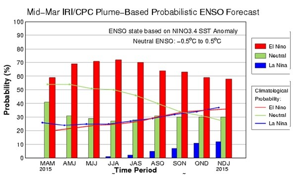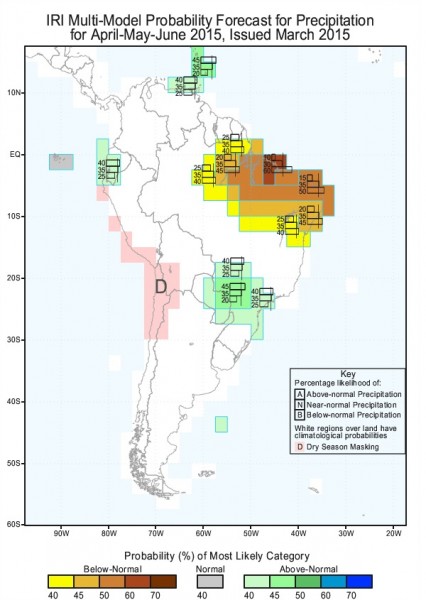 Por último, en la Figura 3, donde se dan los escenarios de lluvia en Sudamérica según el Instituto de mayor prestigio en este tipo de modelado, se ve que para Argentina no hay UN PRONÓSTICO HACIA SITUACIONES SECAS O HÚMEDAS para el período abril-mayo-junio 2015 (en Brasil hay una situación húmeda en el sur (amarillo) y una seca en el noreste (verde), e insistimos que estos modelos son experimentales pero representan una interesante referencia.