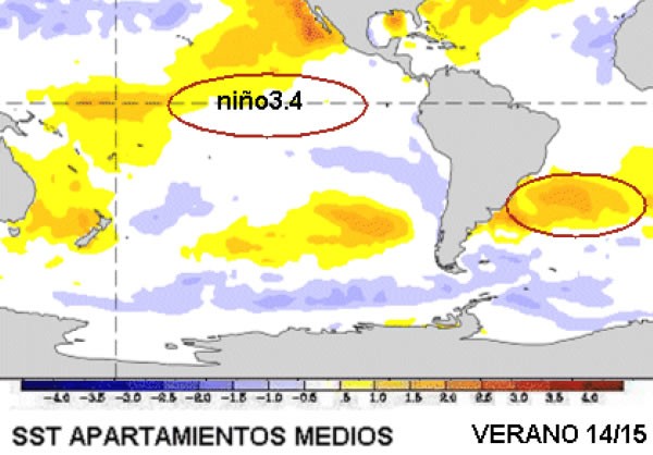 Esta alternancia de zonas secas y húmedas no estuvo vinculada al fenómeno de El Niño, dado que durante la estación estival este indicador se mantuvo muy cercano a la neutralidad, tal como se aprecia en el mapa de anomalía de la temperatura superficial del mar durante ese período.
