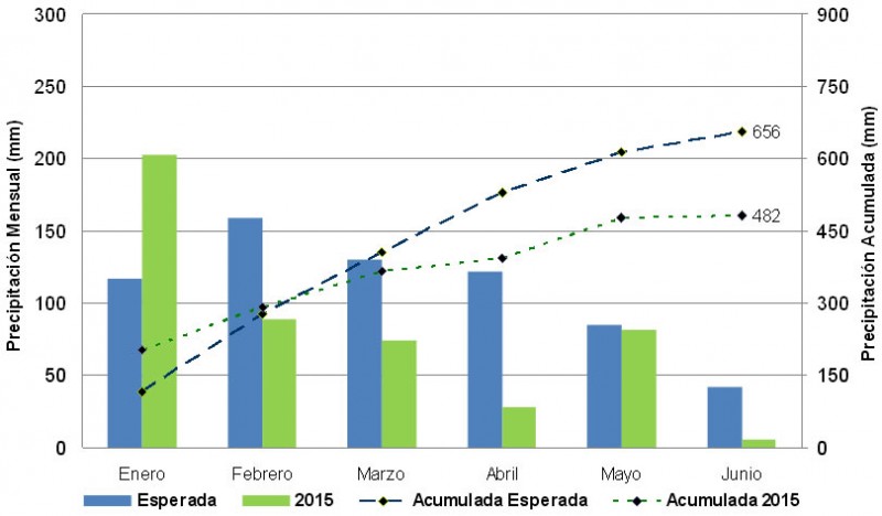 Restando escasos días para la finalización del mes de junio resulta importante analizar el comportamiento de las precipitaciones ocurridas en lo que va del año 2015; a tal efecto se diseñó el Gráfico Nº 1 que refleja el monto de la precipitación promedio mensual y el acumulado anual.