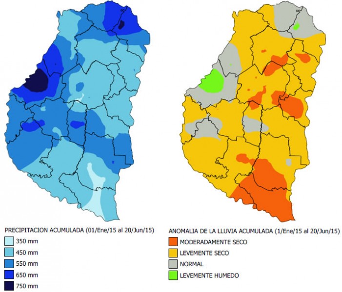 El promedio de lluvia acumulada en Entre Ríos entre enero a junio es de 656 mm y al 20 de junio del 2015 el guarismo se encuentra en 482 mm, arrojando un déficit del 27% (es decir 174 mm).