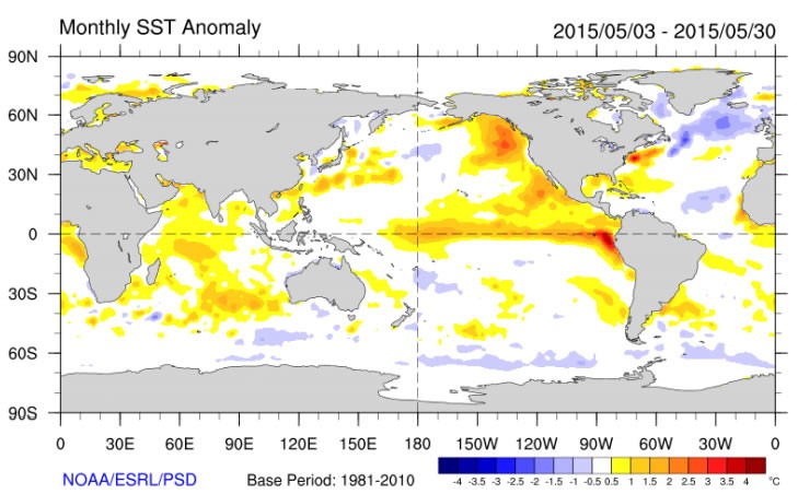 Durante el mes de mayo, al igual que el mes previo se observaron anomalías positivas de la TSM en el océano Pacífico ecuatorial entre la costa sudamericana y 170°E. Las máximas anomalías se encuentran al oeste de 90°W, con valores superiores a +3°C (Figura Nº 1).