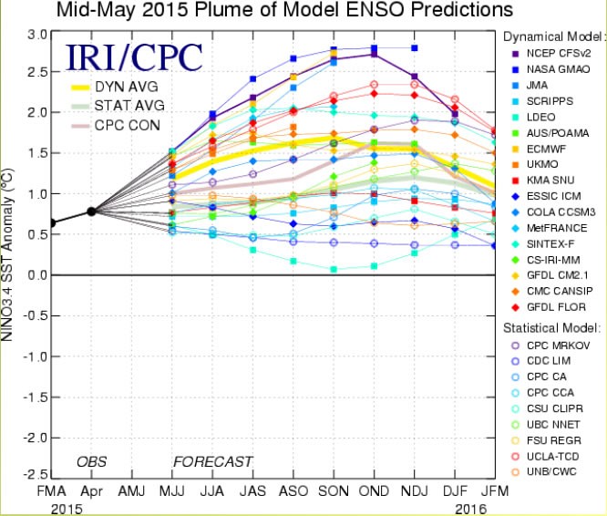 Los pronósticos computacionales en la región Niño 3.4 prevén anomalías superiores a las normales en el trimestre junio – julio – agosto 2015 (JJA). El valor promedio de todos los modelos es de +1.2°C. A más largo plazo dichas anomalías aumentan así como también aumenta la dispersión del ensamble (Figura Nº 2).