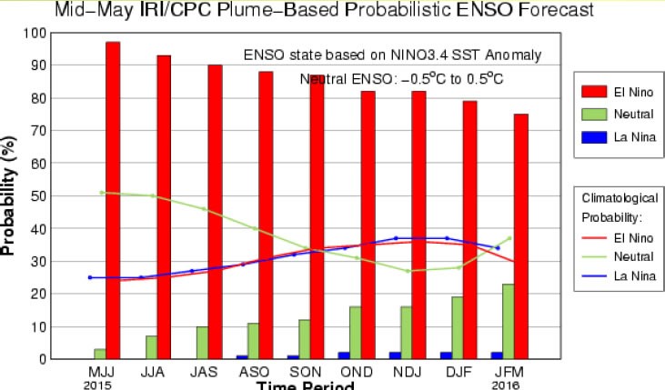 Expresado en valores probabilísticos (Figura Nº 3 ), existe una probabilidad del 93% de que las condiciones sean de Niño durante el trimestre JJA 2015. A más largo plazo las probabilidades de Niño se mantienen altas por lo menos hasta la primavera/inicio del verano.