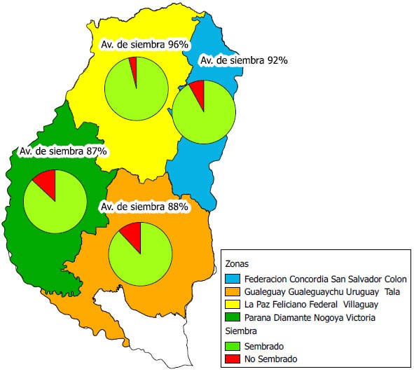En el sector norte y este del territorio se detecta un mayor avance en las tareas de siembra, con rangos entre 92% y 96% (dicho sector de Entre Ríos históricamente posee poco peso en la siembra de trigo, en la campaña 2013/14 abarcó tan solo el 18% del área total).