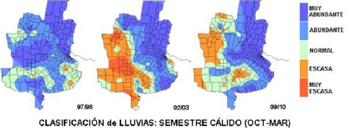 Si hacemos un breve repaso de los episodios cálidos, es decir de los eventos Niño, rápidamente se nos presenta la campaña 97/98 como un ícono, no sólo por el fuerte impacto que tuvo, sino porque fue la primera en poder monitorearse a pleno con imágenes satelitales. Durante aquella campaña, este indicador hasta el momento relegado a claustros académicos, se hizo conocido y rápidamente se popularizó en todo el ámbito donde el clima se vuelve influyente en la toma de decisiones. Con imágenes satelitales contundentes que daban cuenta de las inundaciones que provocaban los ríos Mesopotámicos, el interés por la información sobre esta señal climática fue en aumento y hoy es común que los productores agropecuarios incorporen esta información como una herramienta importante para definir las estrategias en el desarrollo de la campaña. En este sentido es muy importante que sean identificados los posibles impactos sobre la precipitación en las distintas zonas agrícolas del país, dado que no siempre el mismo es tan generalizado o evidente.